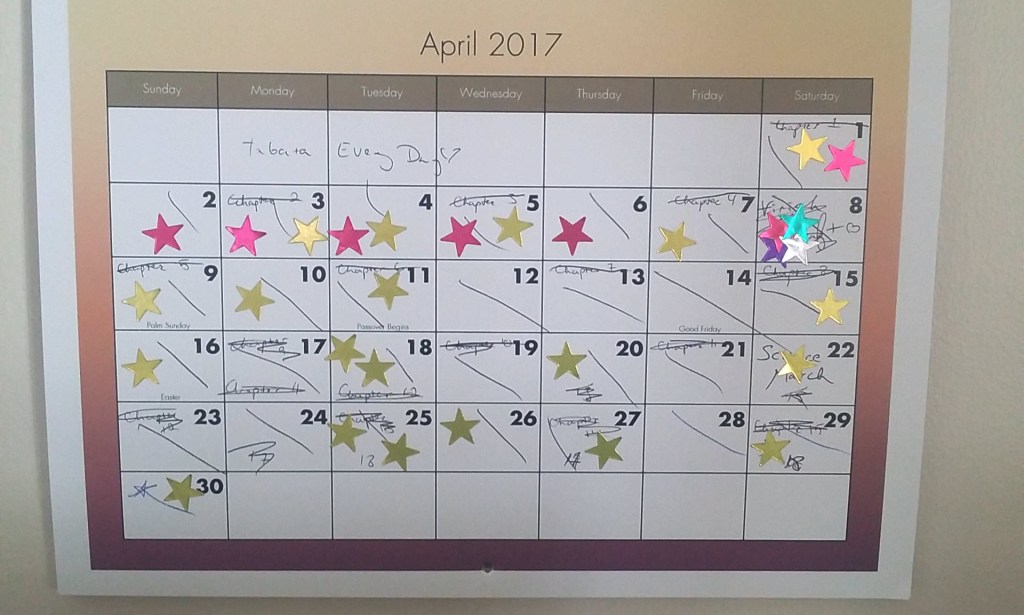 I also tried to project out my goals, but even adjusting for May I’m still wildly off. But that’s okay because lookit all those stars! (The other colors are for exercise-related endeavors. Those are a little… less exciting.)