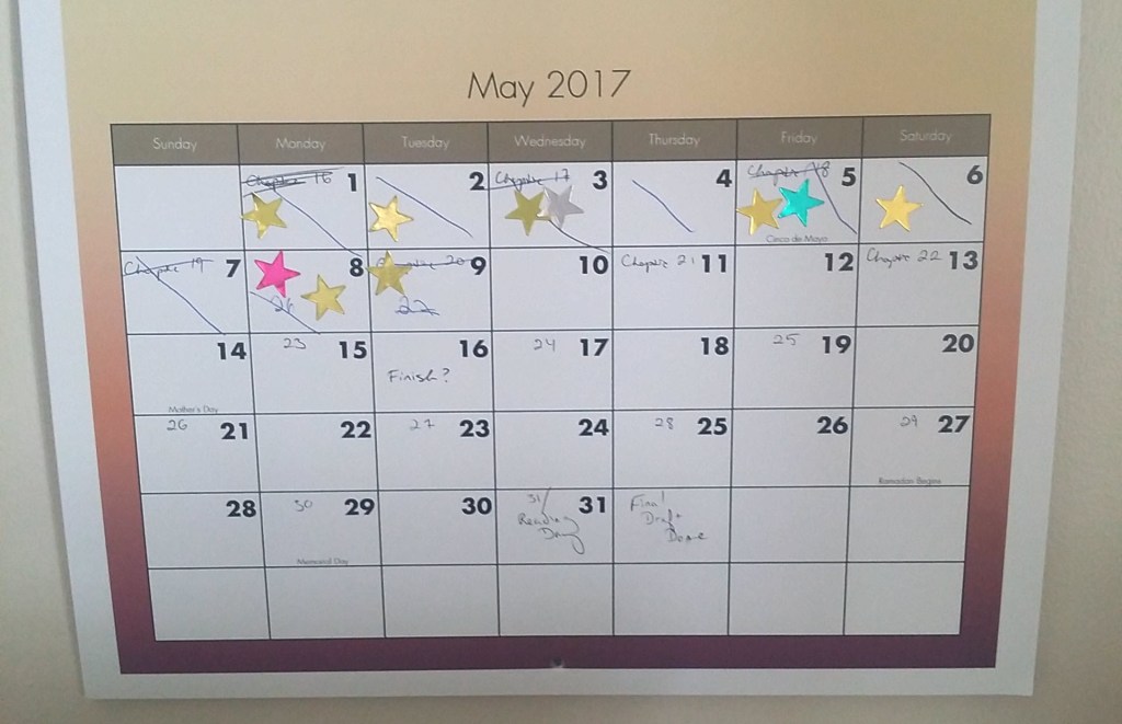 I started by just crossing off days that I’d met my goal. Then I tried writing word count goals on the days and crossing them off as I hit them. This was great for days I inevitably fell behind and also days that I got ahead. And no matter how far behind or ahead I got, I’d recalculate my goals at the start of the next month and better manage my expectations.